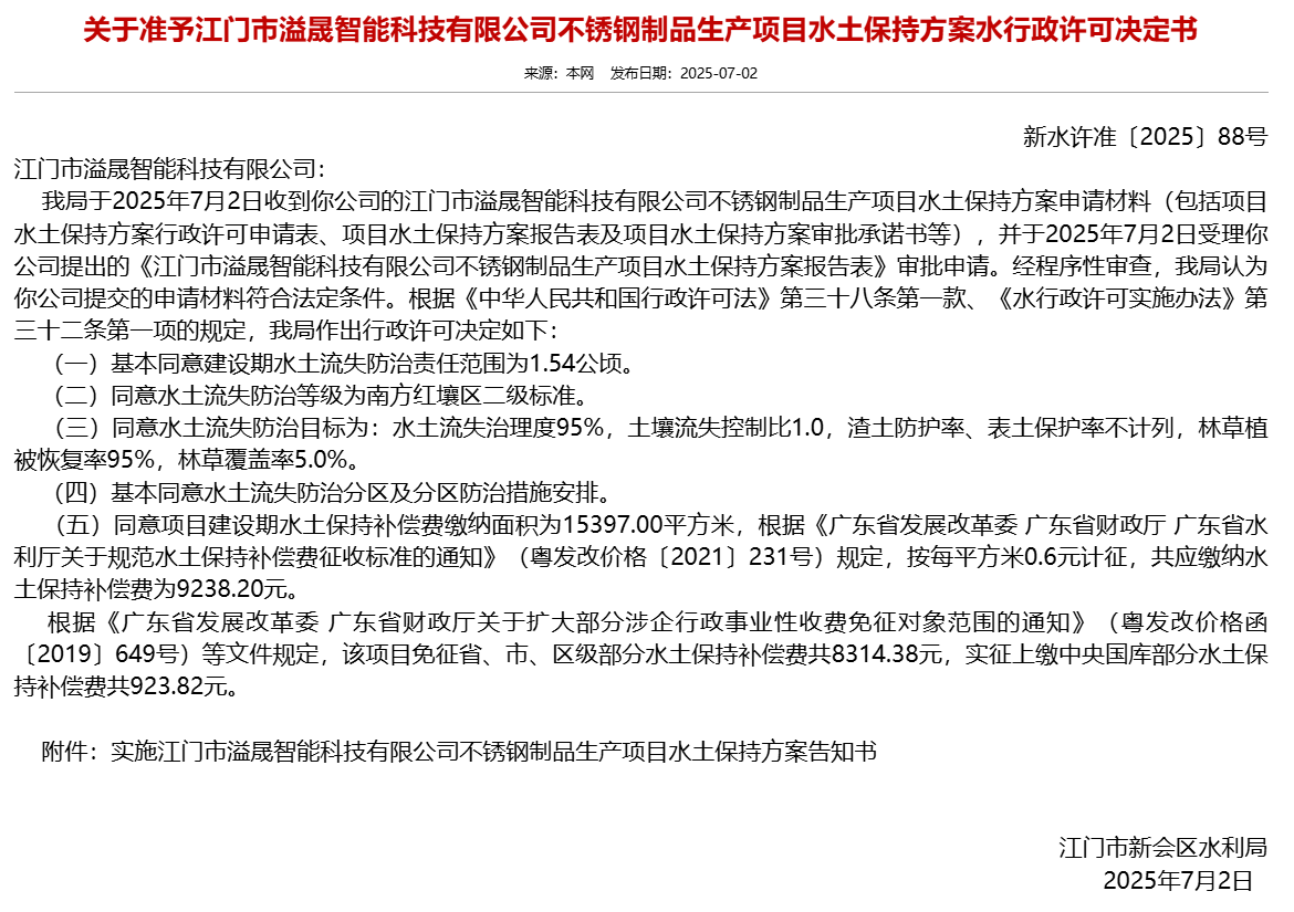 2025年7月2日,江門(mén)市新會(huì )區水利局準予江門(mén)市溢晟智能科技有限公司不銹鋼制品生產(chǎn)項目水土保持方案水行政許可決定書(shū)。