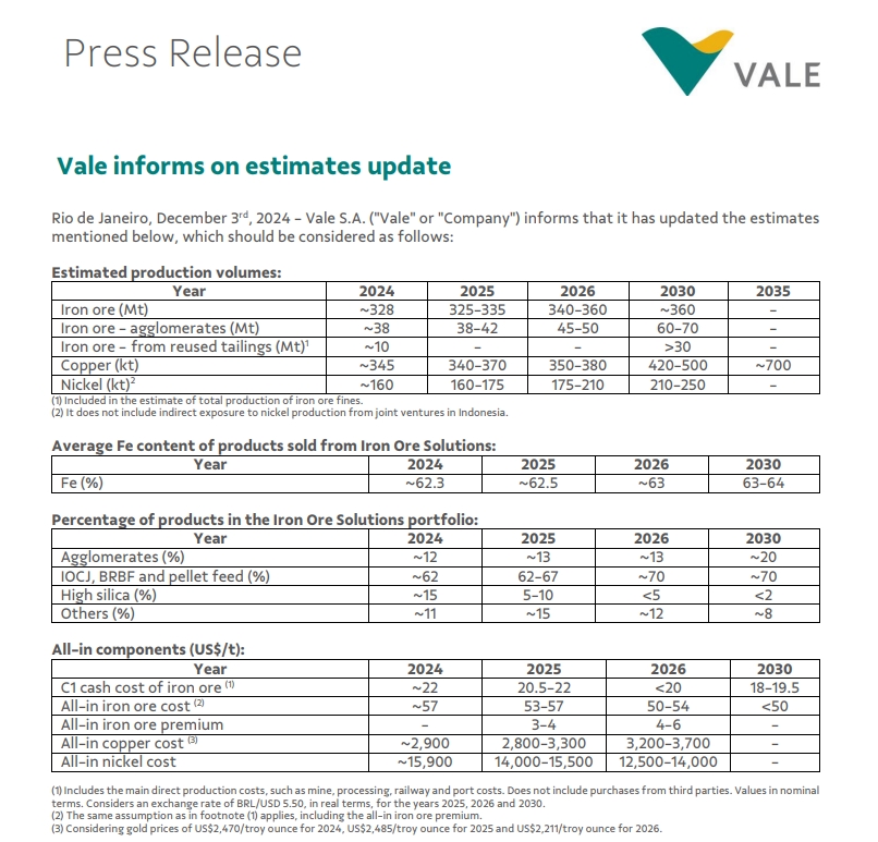 當地時(shí)間12月3日,淡水河谷發(fā)布公告稱(chēng),預計2024年鐵礦石產(chǎn)量約為3.28億噸,2025年為3.25-3.35億噸,2026年為3.4-3.6億噸,2030年約為3.6億噸。