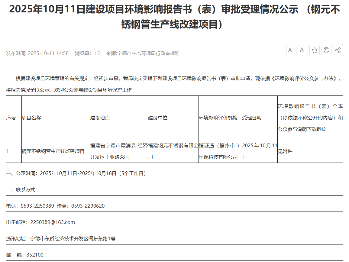 2025年10月11日,寧德市生態(tài)環(huán)境局受理福建鋼元不銹鋼有限公司鋼元不銹鋼管生產(chǎn)線(xiàn)改建項目環(huán)境影響評價(jià)報告表并對外進(jìn)行公示,公示時(shí)間:2025年10月11日-2025年10月16日(5個(gè)工作日)。