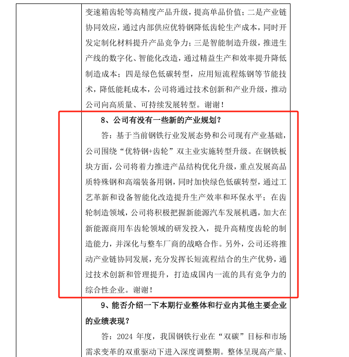 基于當前鋼鐵行業(yè)發(fā)展態(tài)勢和公司現有產(chǎn)業(yè)基礎,公司圍繞“優(yōu)特鋼+齒輪”雙主業(yè)實(shí)施轉型升級。在鋼鐵板塊方面,公司將著(zhù)力推進(jìn)產(chǎn)品結構優(yōu)化升級,重點(diǎn)發(fā)展高品質(zhì)特殊鋼和高端裝備用鋼,同時(shí)加快綠色低碳轉型,通過(guò)工藝革新和設備智能化改造提升生產(chǎn)效率和環(huán)保水平;在齒輪制造領(lǐng)域,公司將積極把握新能源汽車(chē)發(fā)展機遇,加大在新能源商用車(chē)齒輪領(lǐng)域的研發(fā)投入,提升高精度齒輪的制造能力,并深化與整車(chē)廠(chǎng)商的戰略合作。另外,公司還將推動(dòng)產(chǎn)業(yè)鏈協(xié)同發(fā)展,充分發(fā)揮長(cháng)短流程結合的生產(chǎn)優(yōu)勢,通過(guò)技術(shù)創(chuàng )新和管理提升,打造成國內一流的具有競爭力的綜合性企業(yè)。