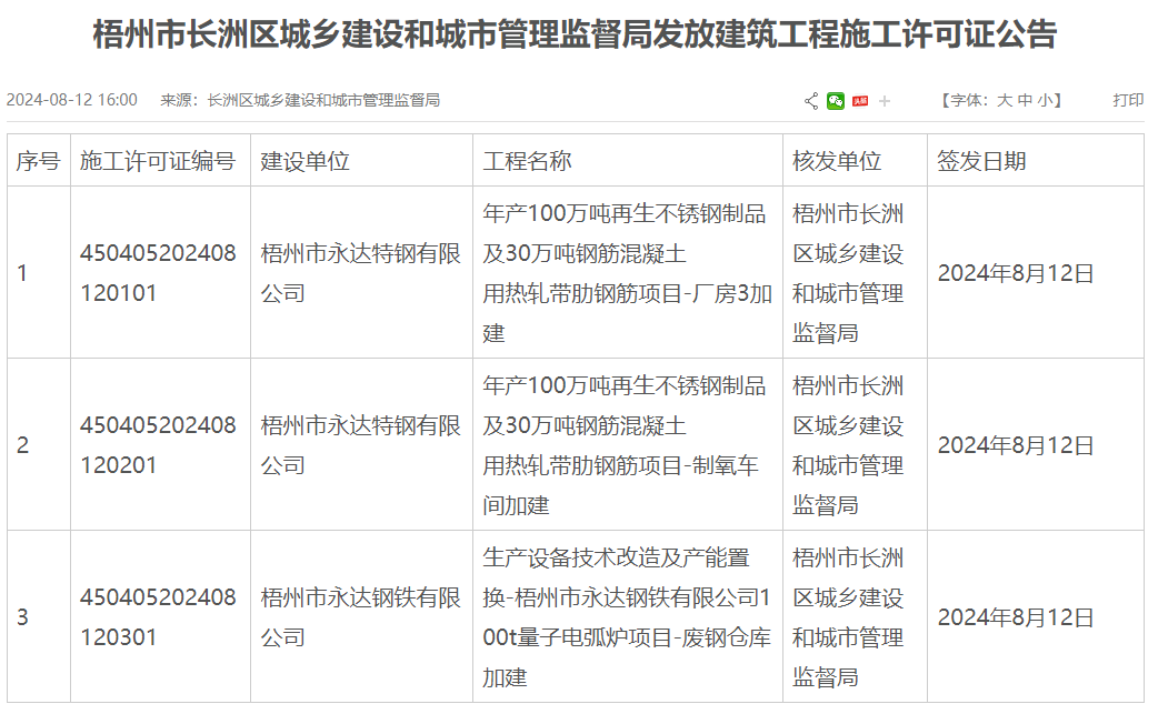 8月12日,梧州市永達特鋼有限公司年產(chǎn)100萬(wàn)噸再生不銹鋼制品及30萬(wàn)噸鋼筋混凝土用熱軋帶肋鋼筋項目廠(chǎng)房3加建、制氧車(chē)間加建以及100t量子電弧爐項目廢鋼倉庫加建均獲建筑工程施工許可證。