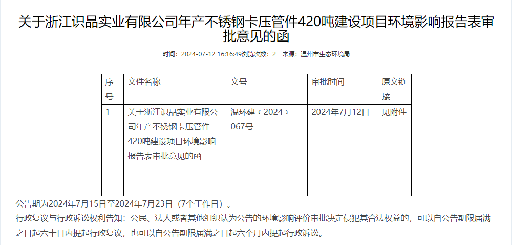 7月12日,溫州市生態(tài)環(huán)境局就浙江識品實(shí)業(yè)有限公司年產(chǎn)420噸不銹鋼卡壓管件建設項目環(huán)境影響報告表作出審批意見(jiàn)并對外進(jìn)行公告,公告期為2024年7月15日至2024年7月23日(7個(gè)工作日)。