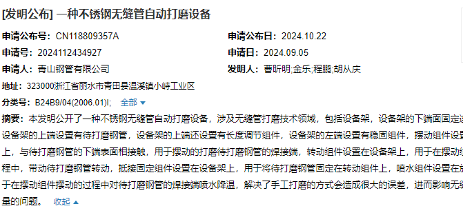 2024年10月22日,青山鋼管有限公司成功申請一項名為“一種不銹鋼無(wú)縫管自動(dòng)打磨設備”專(zhuān)利,申請公布號為CN118809357A,申請日期為2024年9月5日。